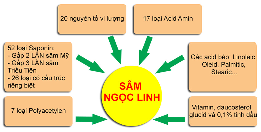 ✔ Những kết quả phân tích thân, rễ và củ của Sâm Ngọc Linh, các nhà khoa học xác định được có các loại Saponin, trong đó có nhiều Saponin có cấu trúc hóa học thường thấy trong sâm Hàn Quốc, sâm Mỹ, sâm Nhật Bản và nhiều Saponin có cấu trúc mới, không có trong các loại sâm khác. Như vậy Sâm Ngọc Linh là một trong những loại sâm có hàm lượng Saponin nhiều.